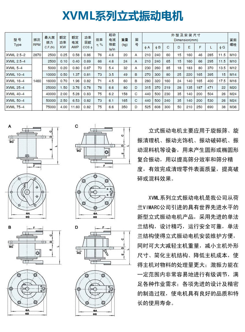 XVML系列立式振動電機是我公司從荷蘭VIMARC公司引進的具有世界先進水平的新型立式振動電機產品,采用先進的單法蘭結構,設計精巧,運行安全可靠,單法蘭結構使得立式振動電機安裝維護方便,同時可大大減輕主機重量,減小主機外形尺寸、簡化主機結構、降低主機成本,使得主機對物料的處理量更大;激振力能在一定范圍內非常容易地進行有級調節(jié),滿足各種作業(yè)需求;各項先進的設計及精密的制造過程,使電機具有良好的品質和特長的使用壽命。